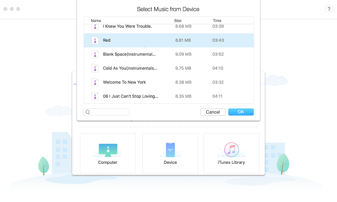 يمكنك اختيار الموسيقى من جهاز الكمبيوتر وجهاز iOS ومكتبة iTunes. فقط خذ خيار الجهاز كمثال. عند النقر فوق خيار، سيتم عرض كل الموسيقى المخزنة على جهاز iOS الخاص بك تلقائيًا. ثم ، يرجى اختيار الموسيقى لتخصيص نغمة الرنين حسب احتياجاتك.